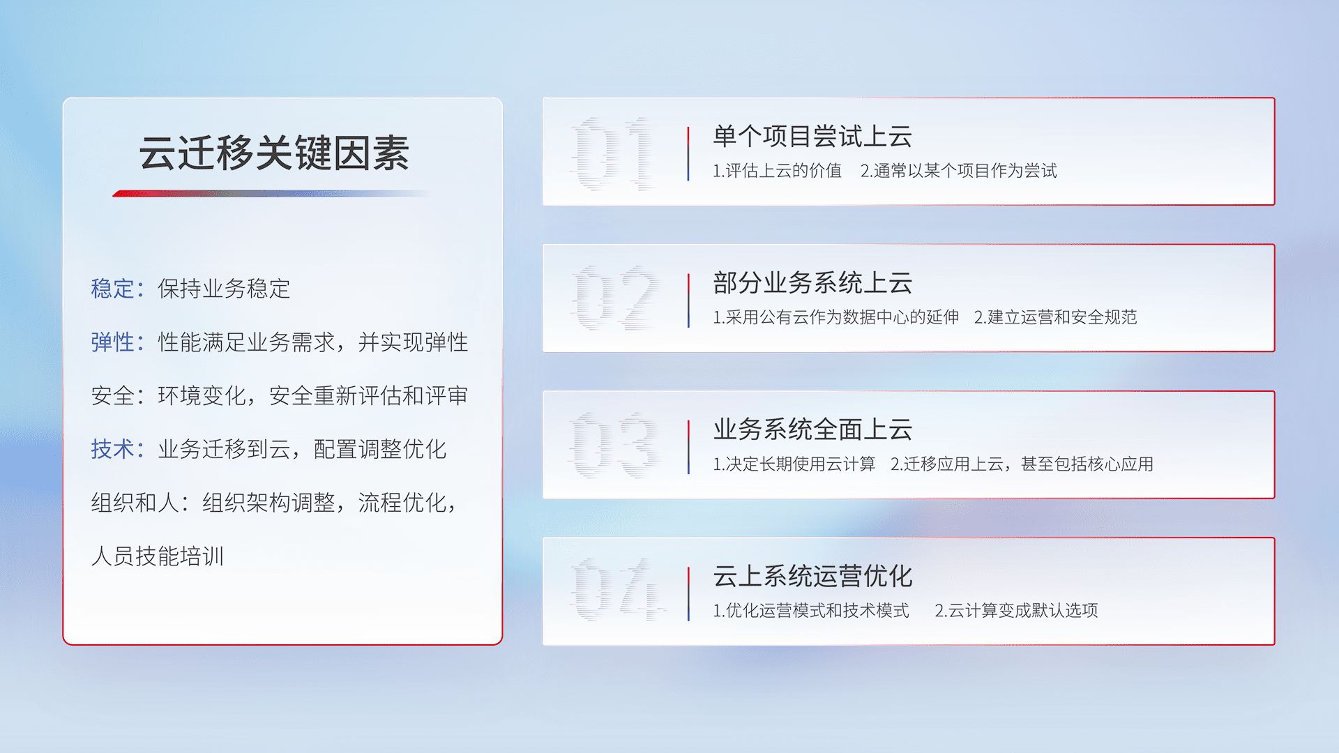结合实际业务,,,从规划设计、、、云平台选型、、、、云原生改造、、数据迁移、、集成交付,,迁移全过程为客户识别最佳上云路径,,做好风险识别管理,,,设计网络架构、、身份权限、、、安全审计合规、、、操作审计、、、、日志审计、、监控告警策略、、、多站点容灾设计等,,,,对云上基础设施进行整体规划,,,提升IT治理水平,,以满足弹性、、高可用、、、、高性能的需求。。。。