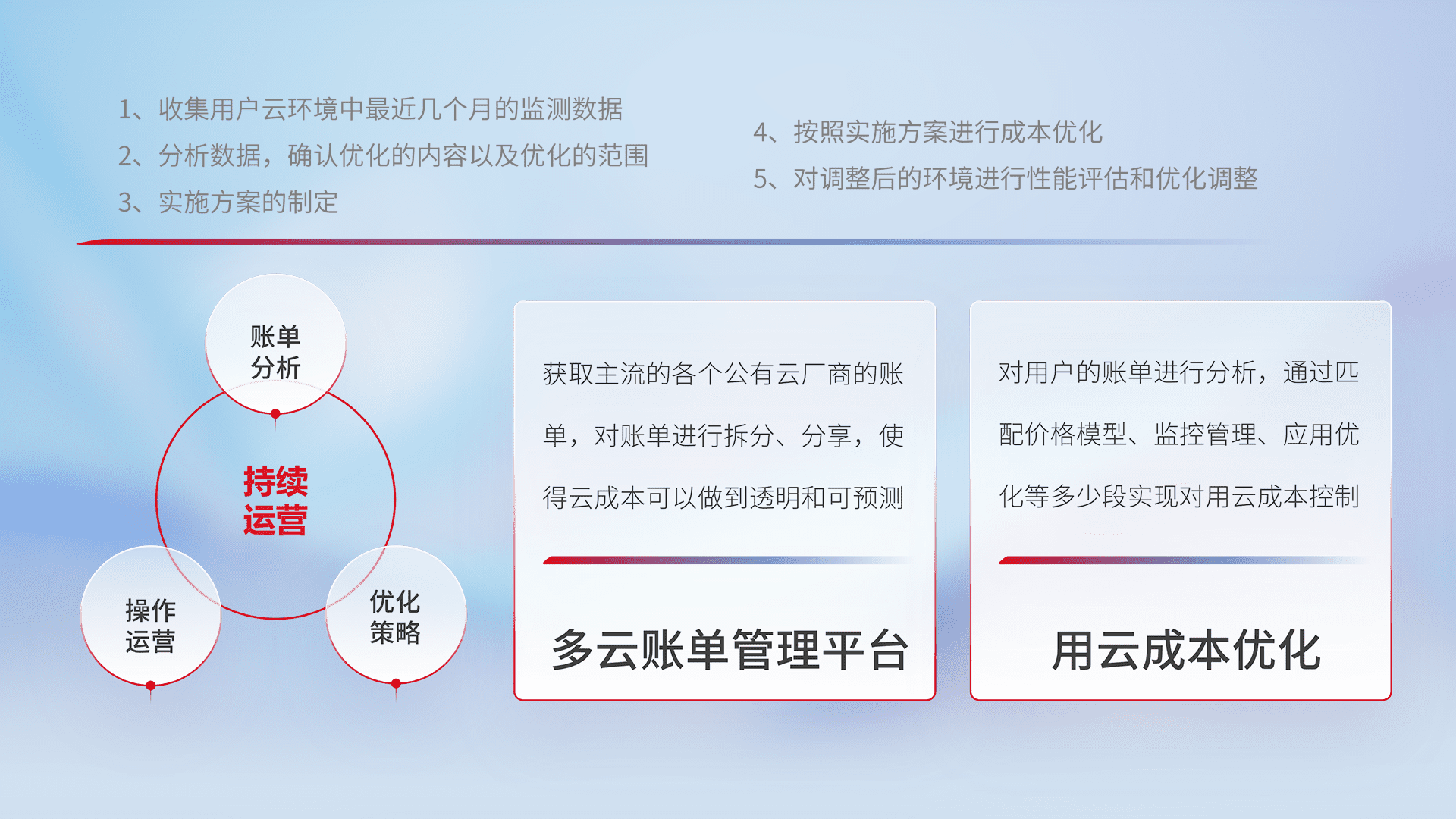 通过多云纳管,,,以统一的资源数据模型把客户的云资源进行抽象和封装,,,,进而实现对多云资源的统一操作,,保障云资源管理的可靠性、、稳定性与可用性。。量身定制化运维内容,,,,配置、、、、开发运维、、补丁管理、、、、备份、、监控、、、认证和访问管理、、、审计和日常巡检等,,,保障在用云过程中的可靠度,,,稳定度以及高可用率。。。